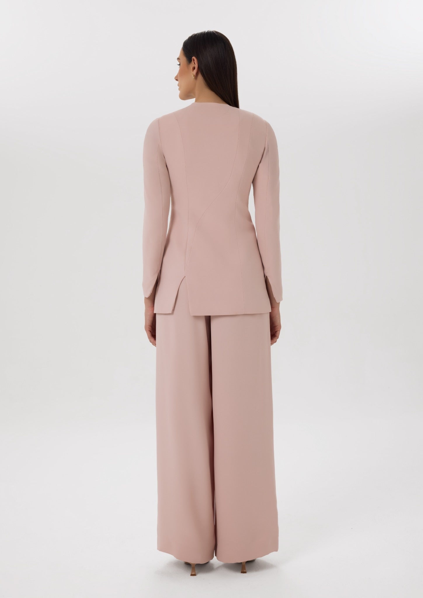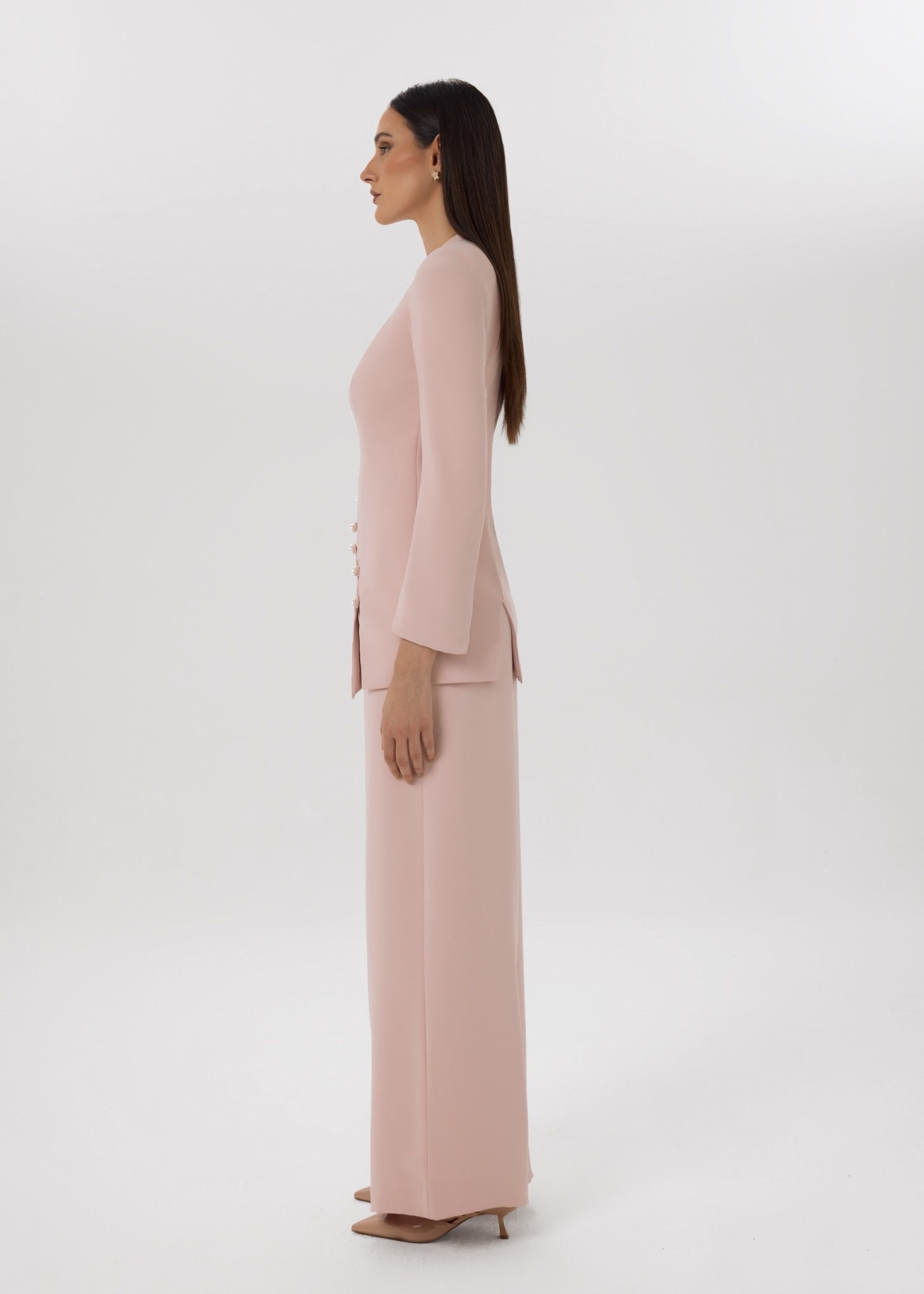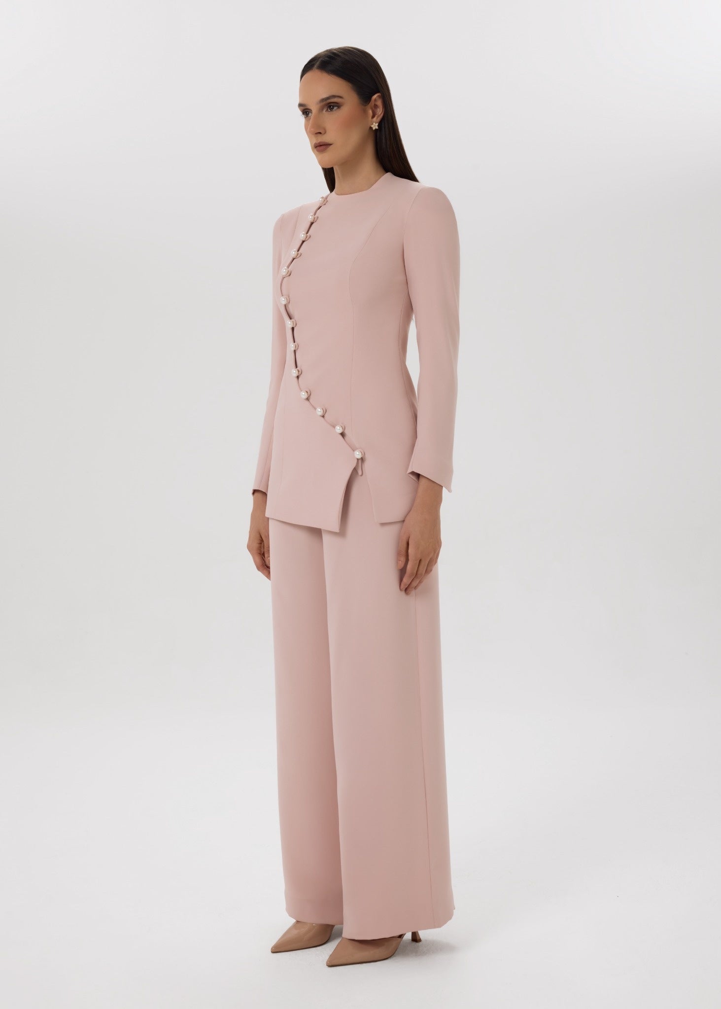 A soft blush co-ord set featuring a tailored longline top with curved pearl-button detailing, paired with wide-leg trousers for a refined silhouette.