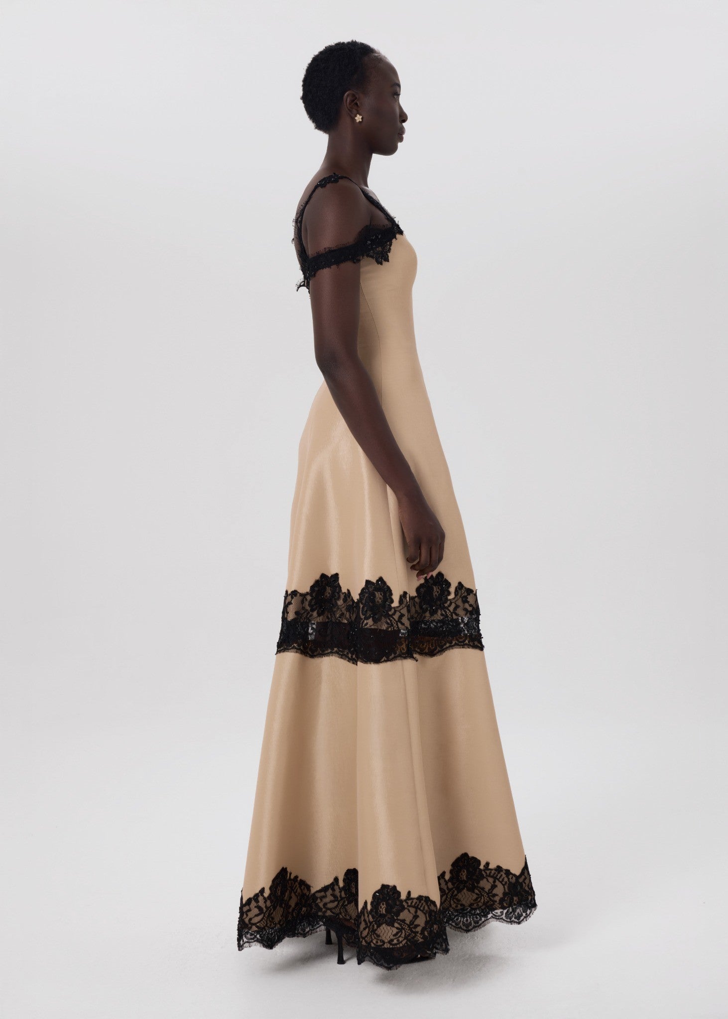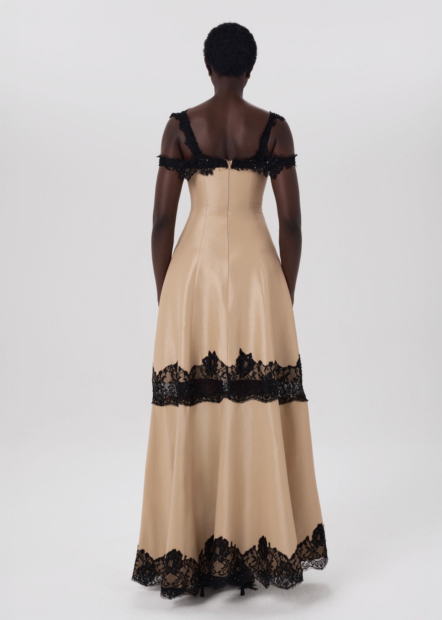 The Poise Dress is a structured beige gown accented with black lace detailing, featuring a fitted bodice, off-shoulder straps, and a flowing skirt that balances strength with femininity.