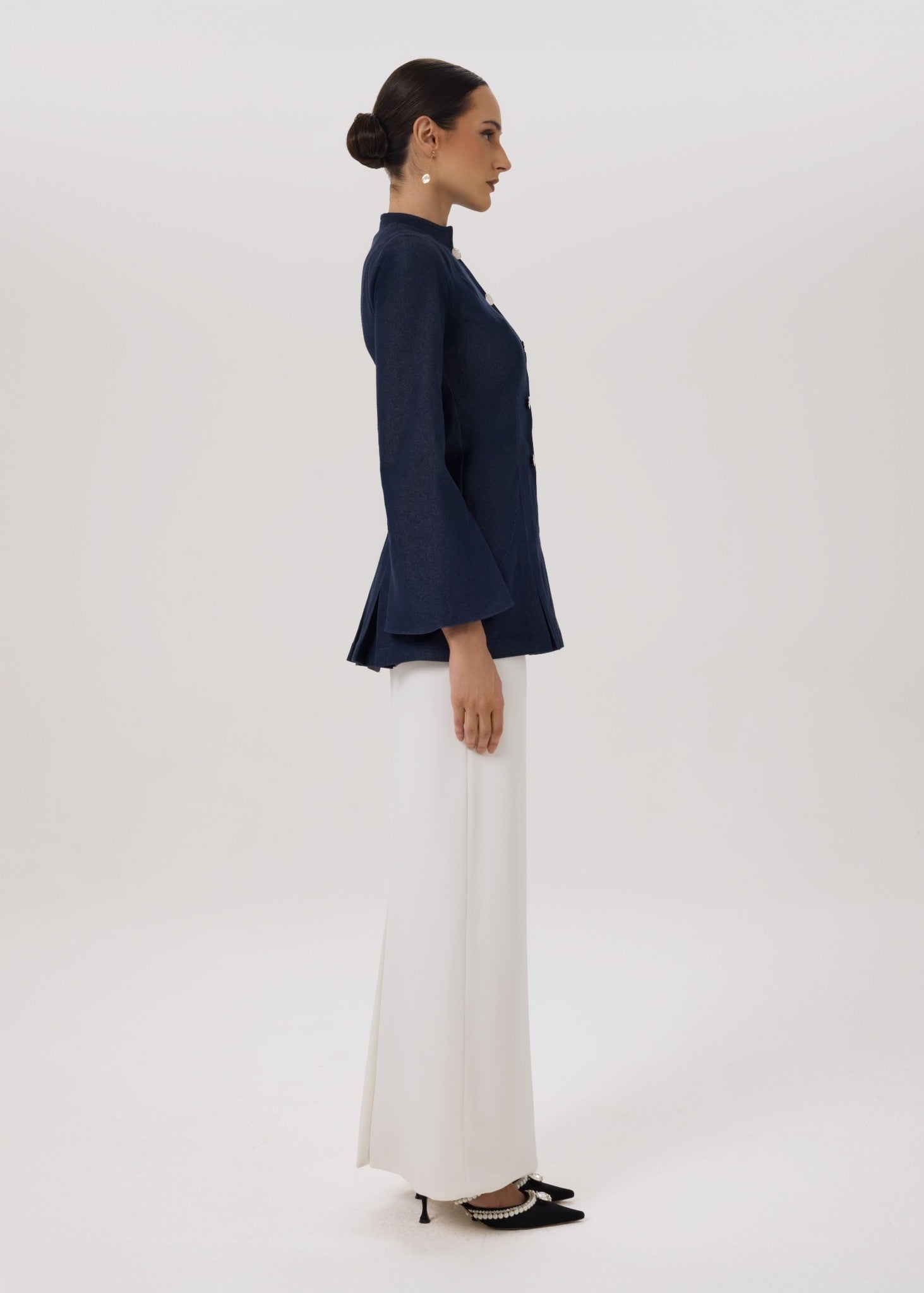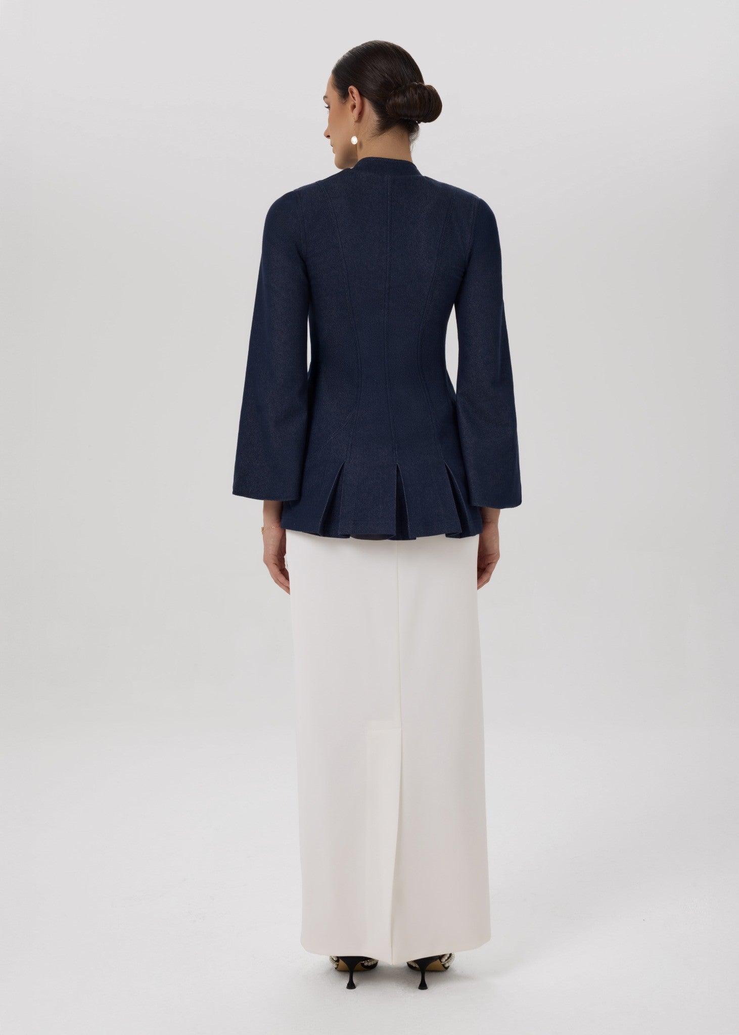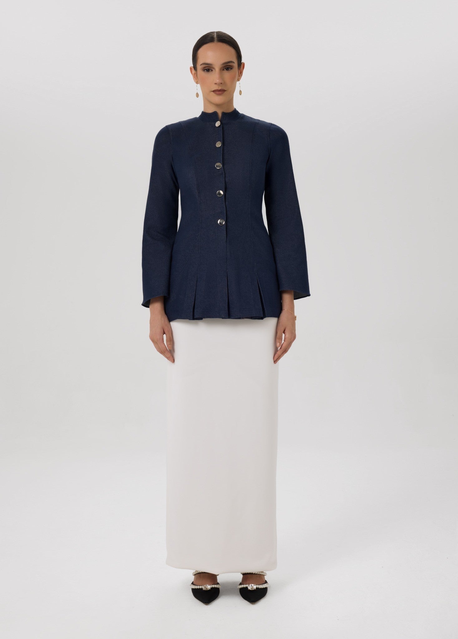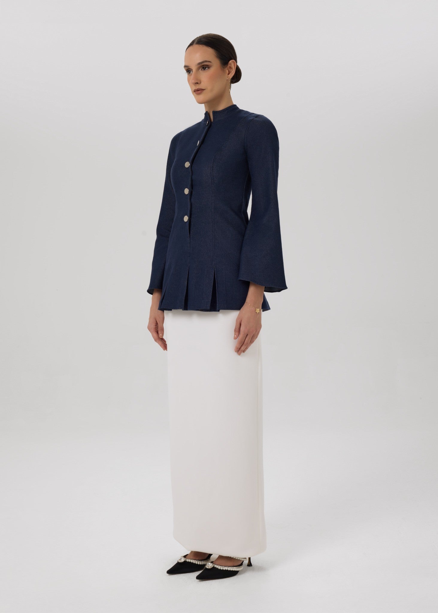 A refined denim jacket paired with a fluid ivory skirt, where structure meets softness in a timeless, feminine silhouette