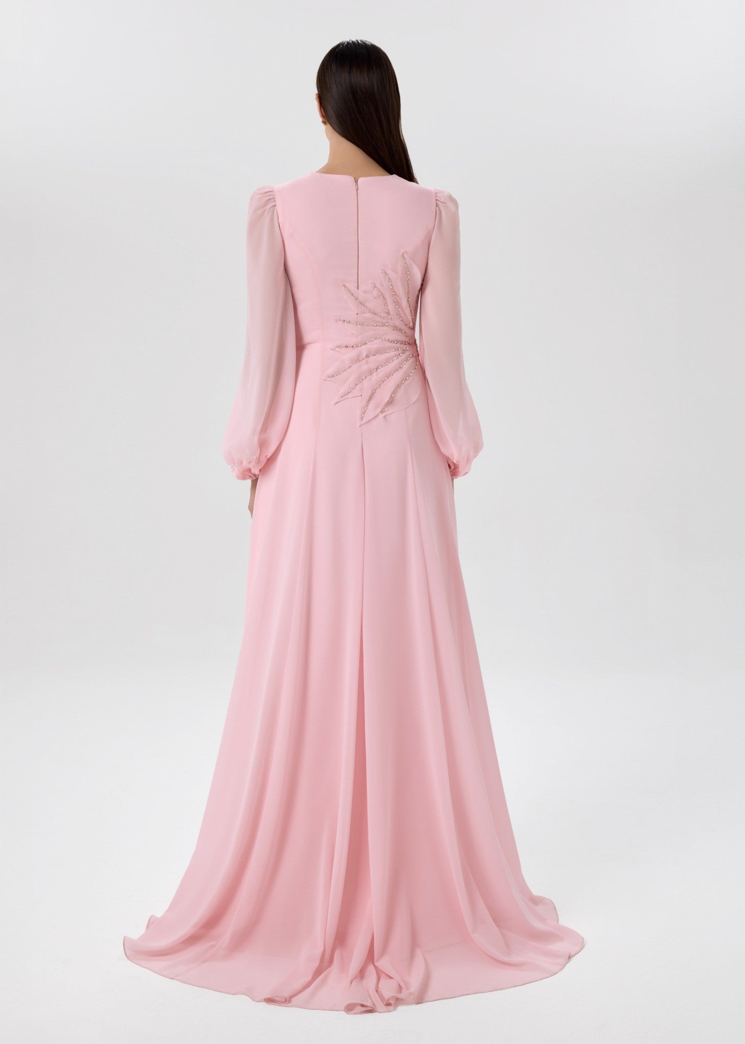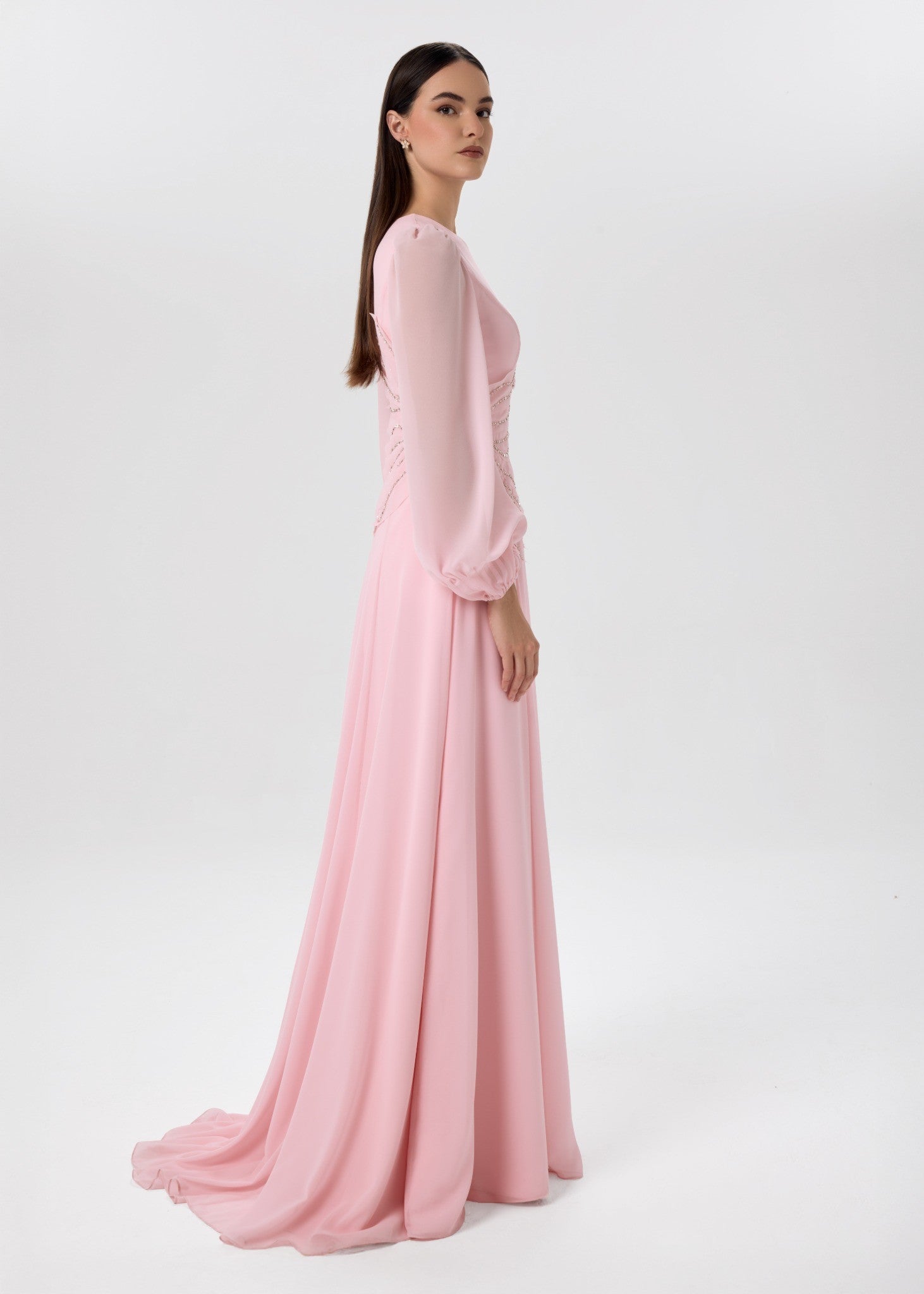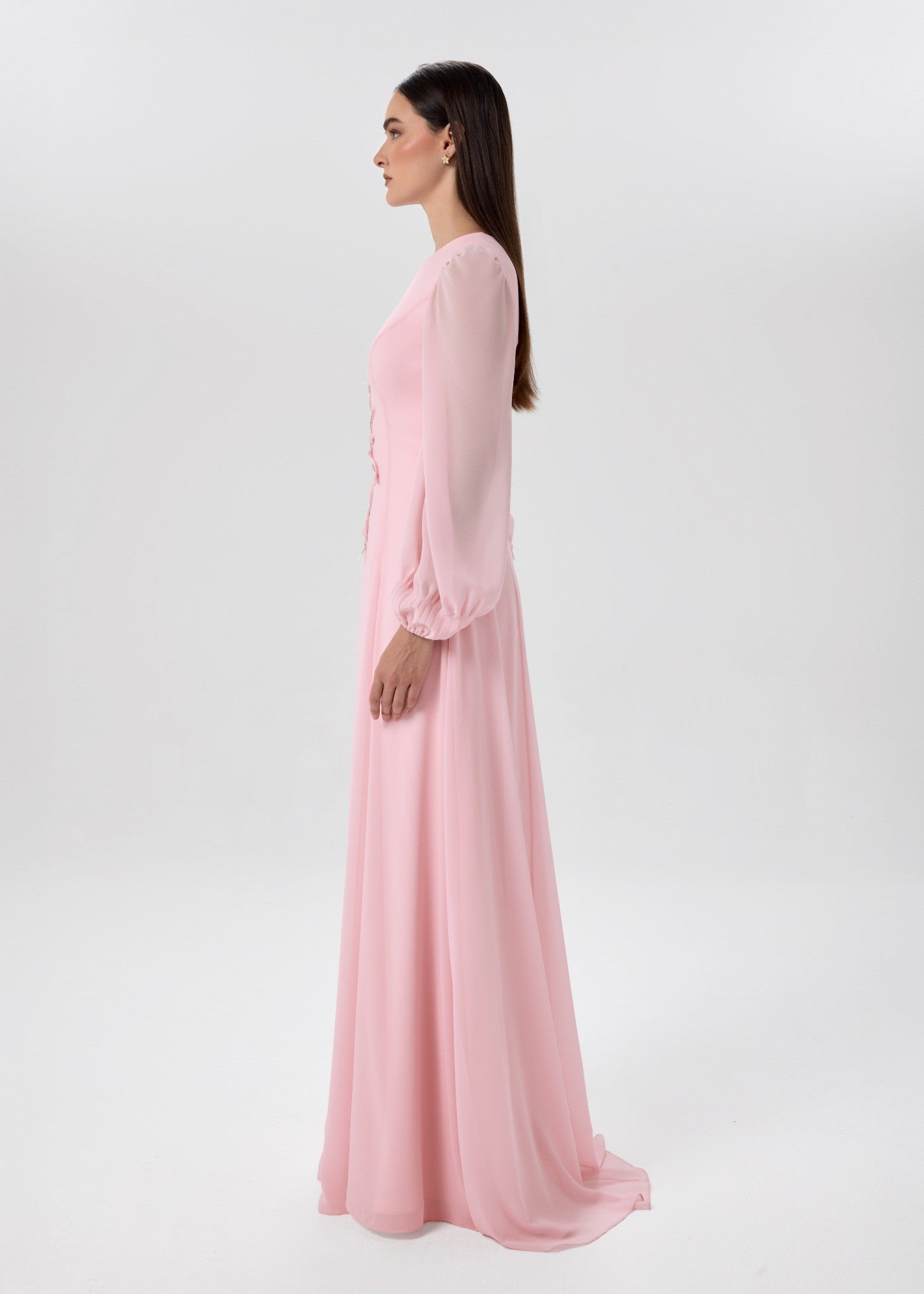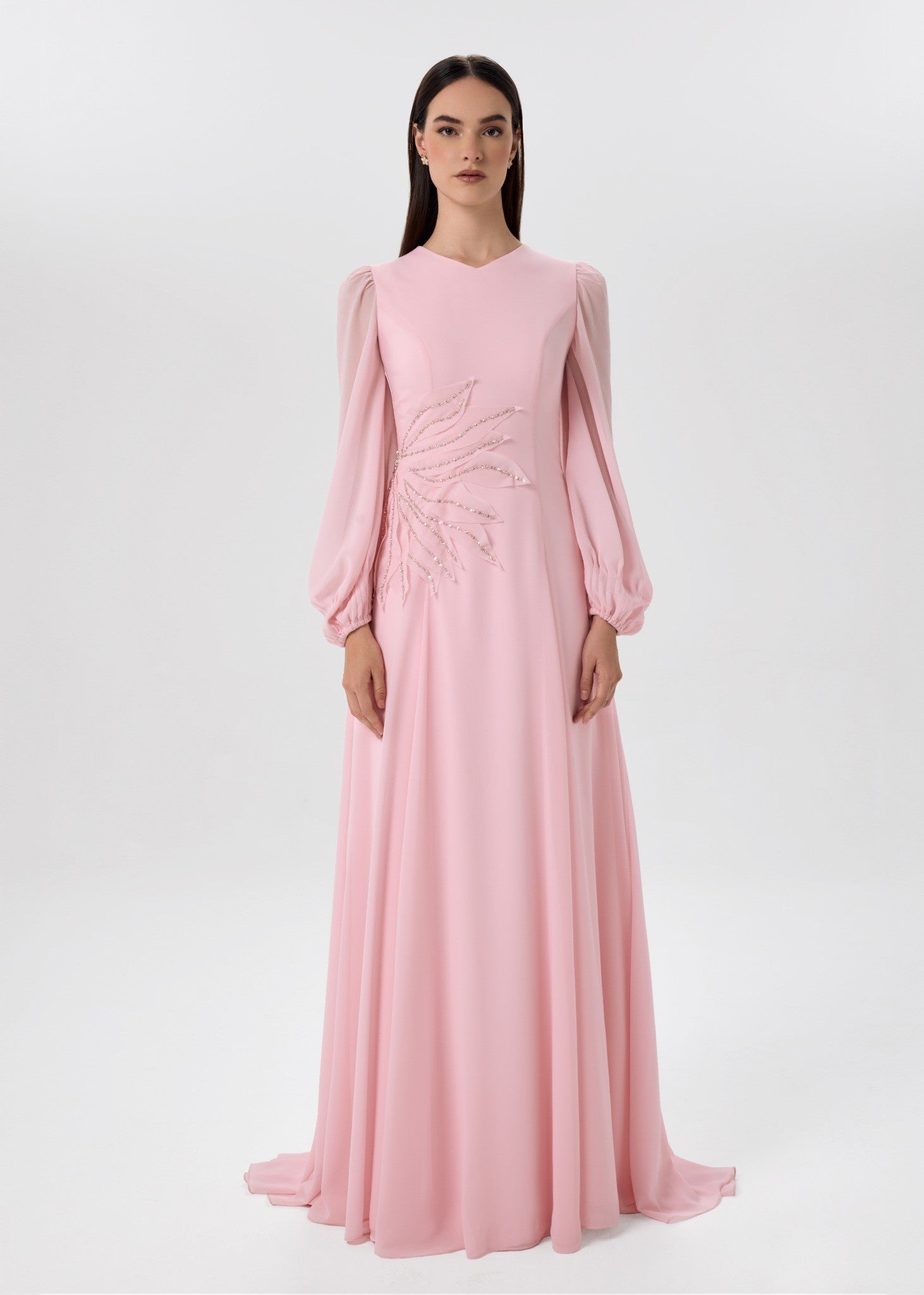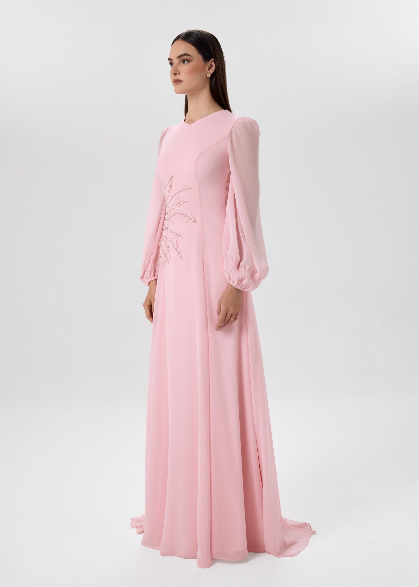 Soft Bloom is a blush pink gown featuring a flowing silhouette, gently puffed sleeves, and delicate floral inspired beadwork that blooms softly across the waist.